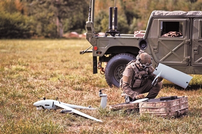 一名士兵在测试使用德国“矢量”侦察无人机