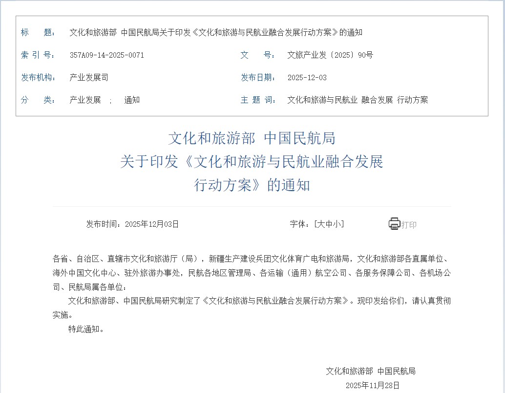 据文化和旅游部网站消息,日前,文化和旅游部、中国民航局联合印发《文化和旅游与民航业融合发展行动方案》(以下简称《行动方案》)。《行动方案》提出,到2027年,旅游出行服务水平显著提高,国际国内旅游航线覆盖更广,融合产品和场景更加丰富多元,文化和旅游与民航业实现更深层次、更大范围、更高质量的融合,形成需求牵引供给、供给创造需求的良性发展格局。