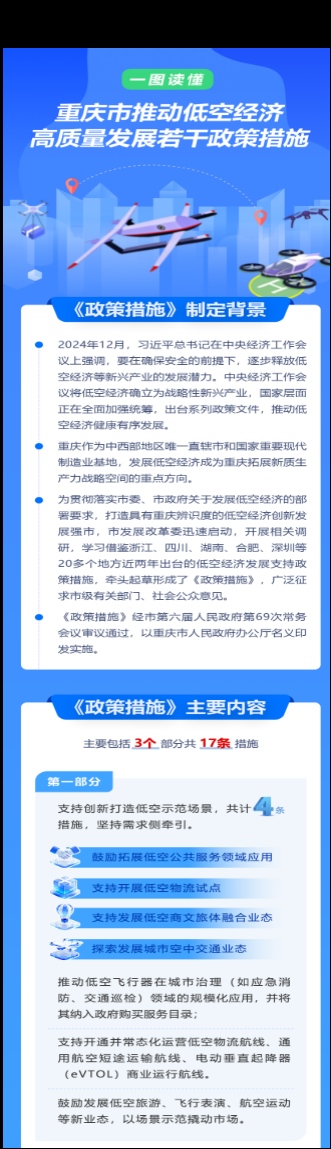 重庆作为中西部地区唯一直辖市和国家重要现代制造业基地,发展低空经济成为重庆拓展新质生产力战略空间的重点方向。为贯彻落实市委、市政府关于发展低空经济的部署要求,打造具有重庆辨识度的低空经济创新发展强市,市发展改革委迅速启动,开展相关调研,学习借鉴浙江、四川、湖南、合肥、深圳等20多个地方近两年出台的低空经济发展支持政策措施,牵头起草形成了《政策措施》,并广泛征求市级有关部门、社会公众意见。《政策措施》经市第六届人民政府第69次常务会议审议通过,以重庆市人民政府办公厅名义印发实施。