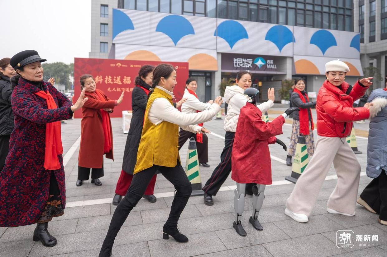 除了送腊八粥,现场活动纷呈。身着新年服饰的机器人带领老少共练八段锦,灵活的机器狗穿梭派送粥品……