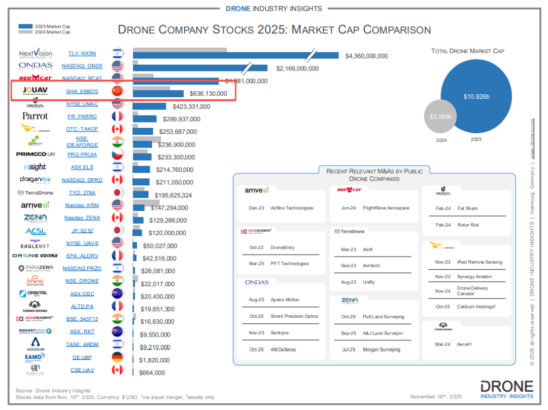 近日,国际权威无人机行业研究机构德国 Drone Industry Insights (Droneii)发布了2025年度全球无人机上市公司市值排名。