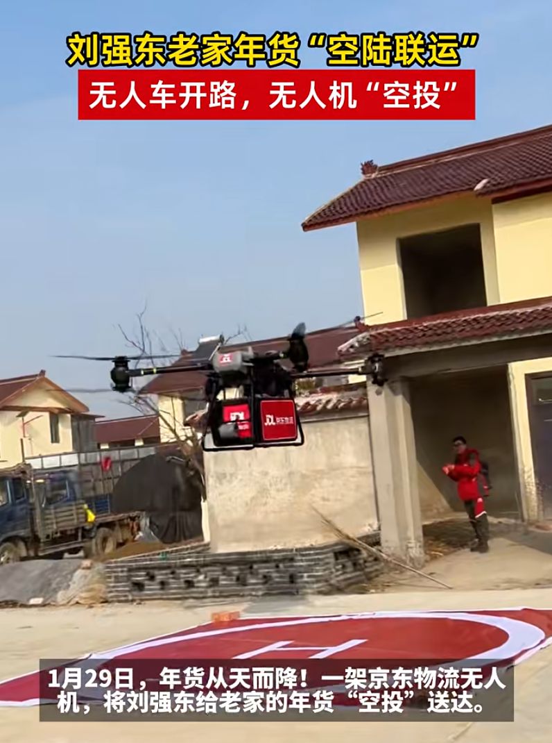 无人机把刘强东的年货给乡亲送到门口了