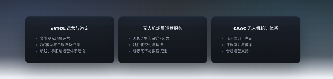 公司围绕低空经济发展中的实际需求,重点布局 eVTOL 运营体系咨询、无人机场景运营服务及无人机培训等业务方向,强调从需求识别、体系设计到执行落地的全流程能力建设。在业务推进过程中,航链航空注重安全优先、体系优先、场景导向和稳健执行,致力于形成可执行、可交付、可持续推进的服务能力。
