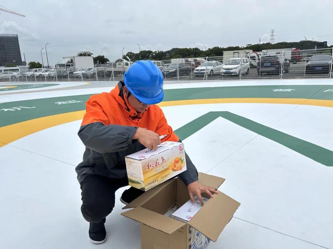 桃花蜜桔通过无人机送抵。共享联盟·普陀 王若琦 摄