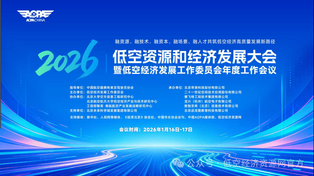 经低空经济发展工作委员会(以下简称“低空委”)研究决定,现定于2026年1月16日~17日在北京召开2026年低空资源和经济发展大会暨低空经济发展工作委员会年度工作会议,就低空经济政策协同、技术创新、场景应用及资本对接等议题进行专题研讨,并总结2025年度工作,部署2026年度重点任务。现将有关事项通知如下: