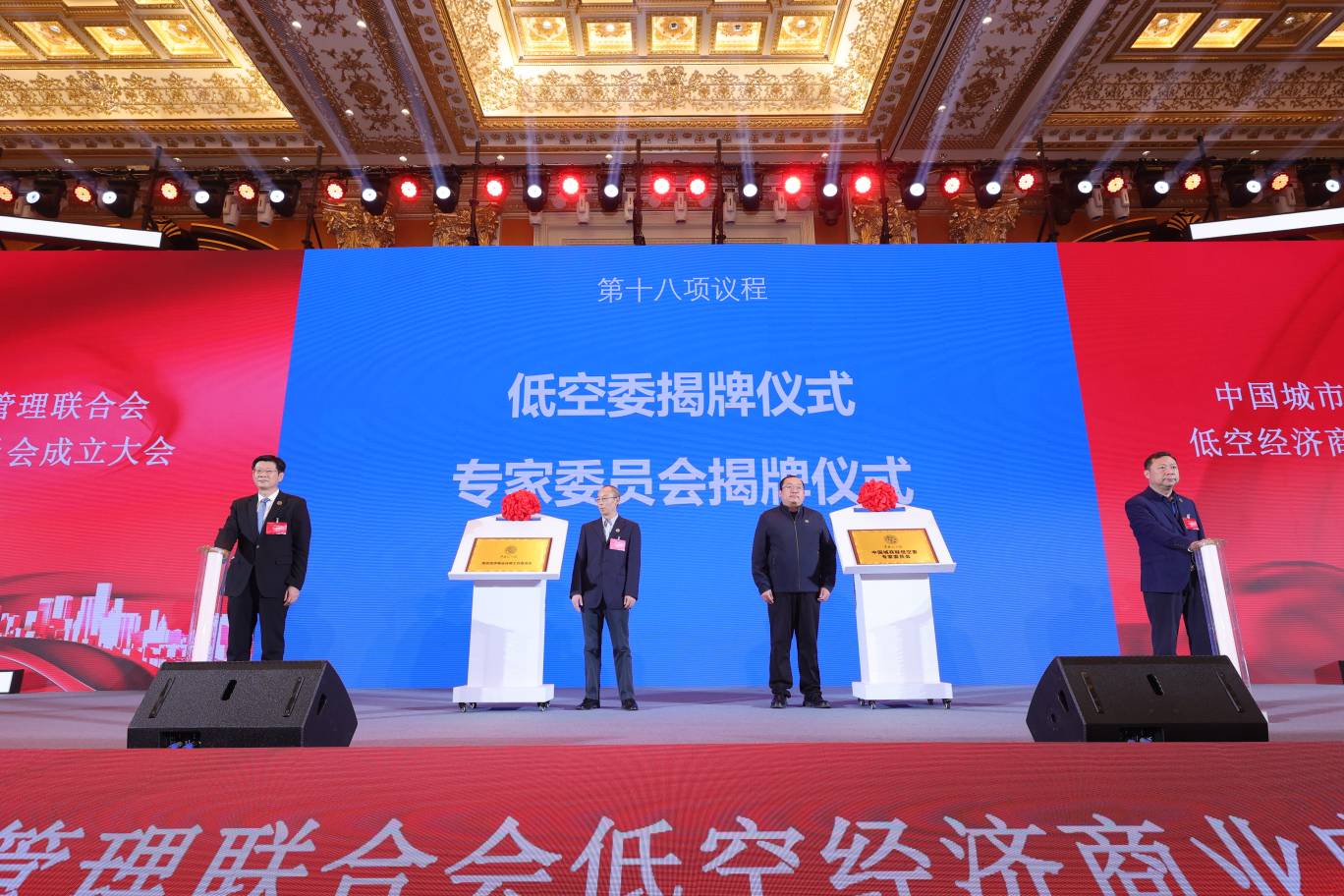中国城商联会长宣春雷、国际通用航空协会中国委员会主席沈广忠为低空委及专委会揭牌,低空委执行主任张正甲及专家代表刘刚共同见证。至此,中国城商联低空委正式成立。